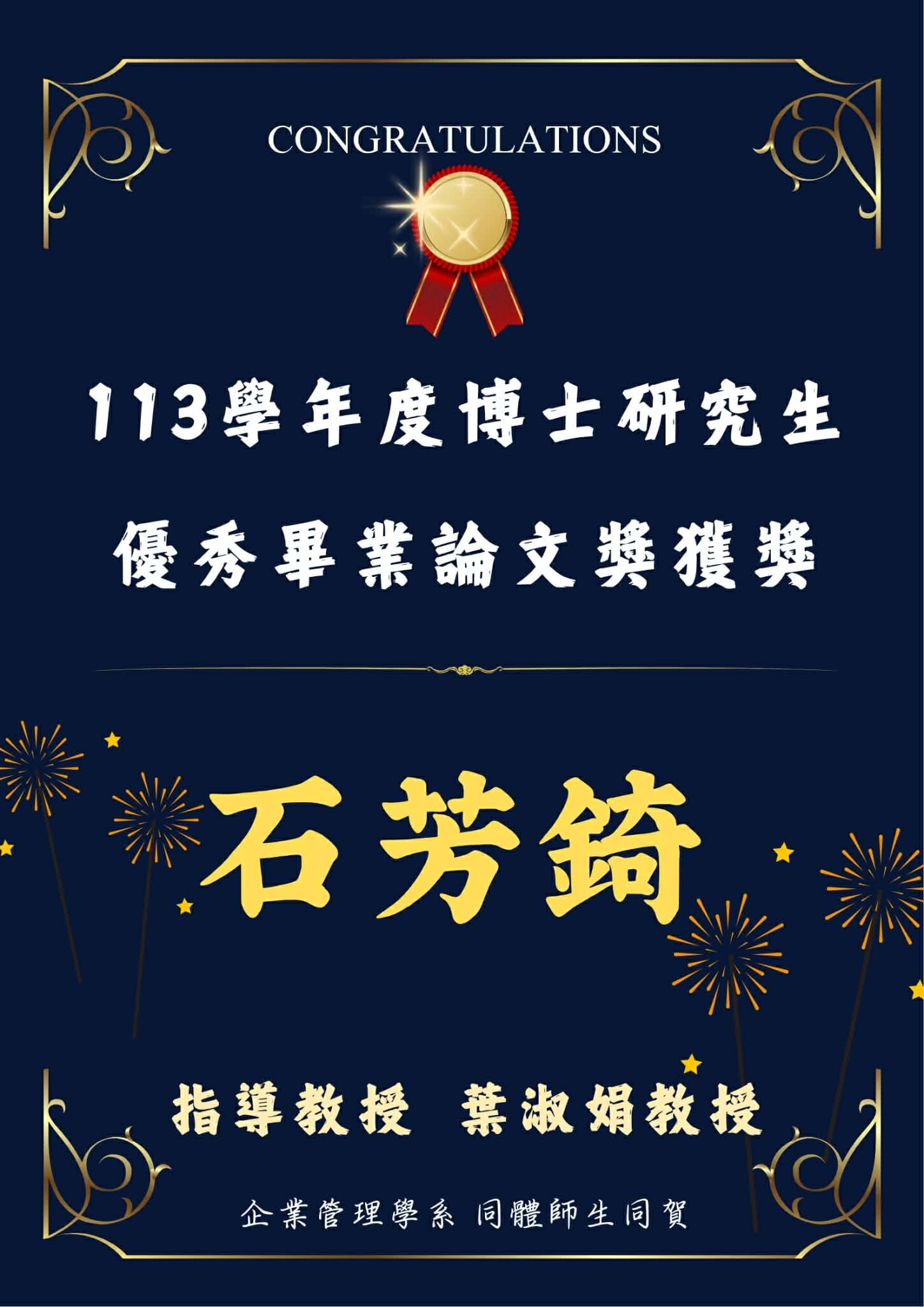 2025-12-11 恭賀! 博士生石芳錡 (指導教授:葉淑娟)榮獲113學年度博士研究生優秀畢業論文獎