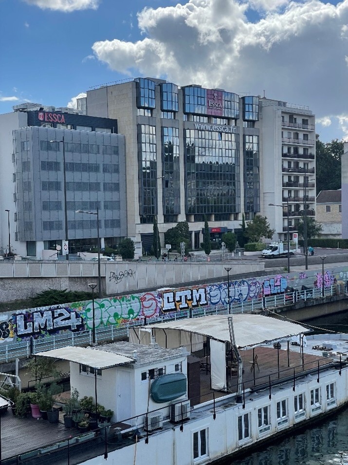 ESSCA的巴黎校區位於 Boulogne-Billancourt(布洛涅-比揚古),這個地區緊鄰巴黎第十六區,是交通便利、生活機能完善的地區,校區距離地鐵站僅需步行幾分鐘,周邊有許多咖啡廳、超市、公園,對交換生而言是一個非常適合學習與生活的環境,由於校園設計現代且集中,加上教學大樓指示牌清楚,很快就能熟悉動線與主要教室位置。